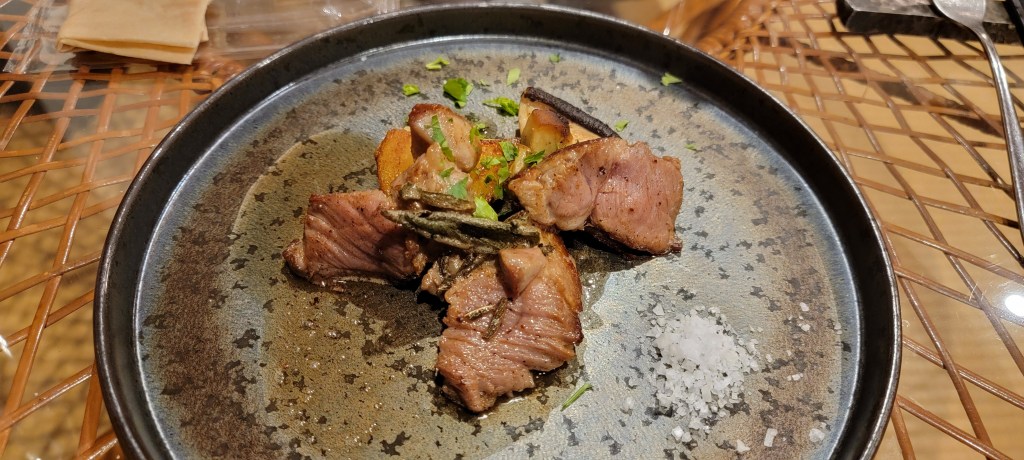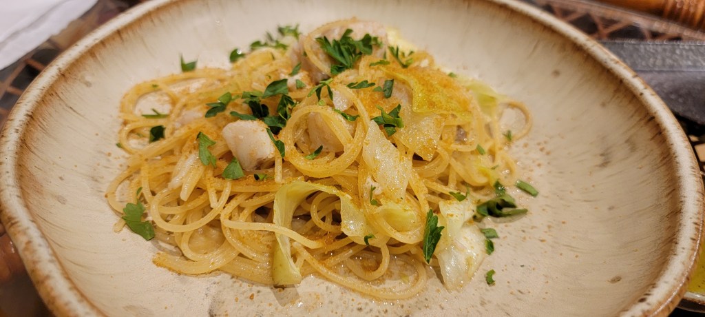 My lodgings in Yunotsu were well beyond what I expected from such a small town! I stayed in a private room at the Watowa guest house (they also offer hostel-style options), which seemed to be an older building converted by the owners into what is now a rather glamorous option for visitors to Yunotsu. Besides the generously large living space and brand-new kitchen fixtures, there was also an on-site restaurant which hosts a rotating cast of guest chefs. During my stay the chef was from Ajikura, another restaurant in Shimane, and the incredible Italian inspired course meals he prepared were truly out of this world. The local specialty, Iwami pork, (Iwami being the name of a former province where Shimane is now located) was a highlight of many of the dishes, and its rich flavor reminded me more of beef than anything porcine!